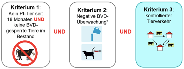 Für das erste Kriterium darf in den letzten 18 Monaten kein PI-Tier auf dem Betrieb gewesen sein und aktuell kein Tier im Bestand wegen BVD gesperrt sein.