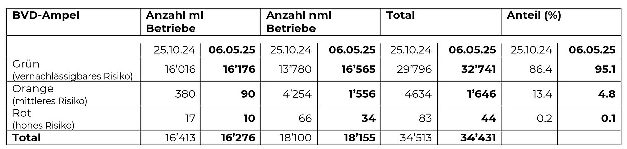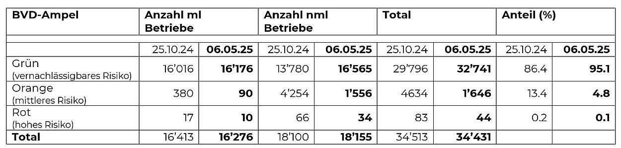 Die BVD-Ampel hat keinen Einfluss auf den heute geltenden BVD-Status; sie ist ein Hilfsmittel in der zweijährigen Übergangsphase. Der heutige Status «nicht gesperrt», «Einzeltiere gesperrt» oder «gesperrt» wird erst auf den 1. November 2026 abgelöst durch den neuen Status «BVD-frei» oder «Nicht BVD-frei». Der neue Status wird die BVD-Situation bis zu 24 Monate zurück berücksichtigt. Der heute geltende BVD-Status berücksichtigt einzig, ob auf dem Betrieb aktuell ein BVD-Fall oder ein -Verdacht vorhanden ist oder nicht.