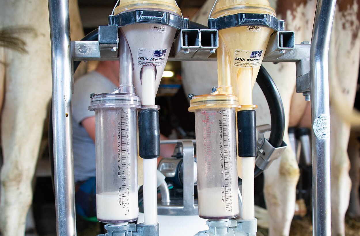 Les épreuves d’aptitude à la traite servent à déterminer le comportement de traite d’une vache. À l’aide d’une machine à traire avec 2 tubes gradués et un pulsateur uniforme, le contrôle de l’aptitude à la traite est effectué à partir d’une traite. Dans le cadre du contrôle, le débit laitier moyen par minute (DMM) et l’indice antéro-postérieur (IAP) sont déterminés.